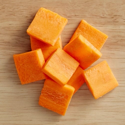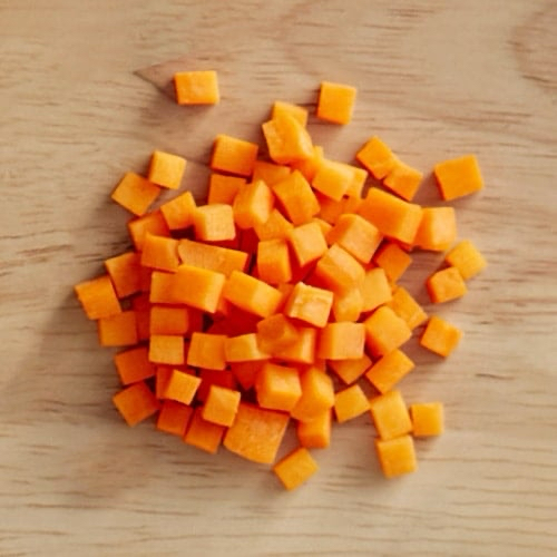 The resulting cubes release moisture and aromatic compounds quickly because their surface area is high relative to their size. As they cook, they disperse evenly into sauces, soups, or aromatic bases.